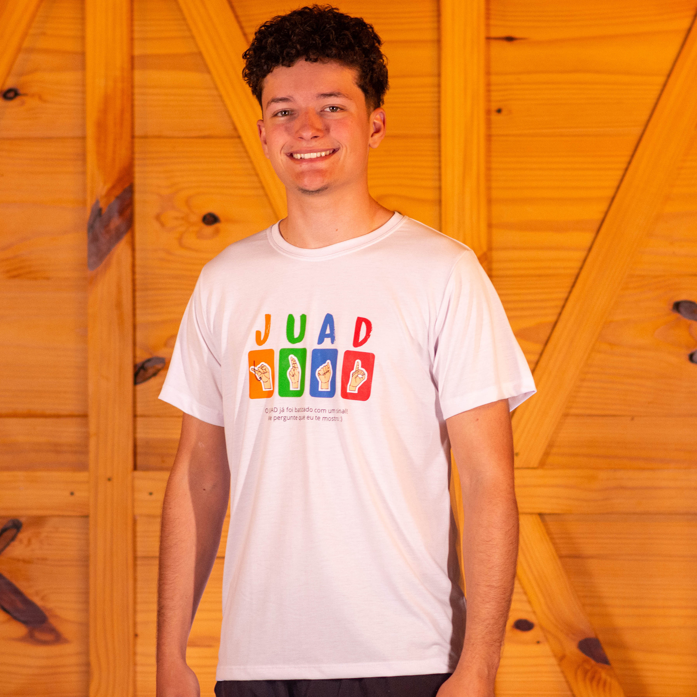 Camiseta em poliviscose na cor branca com a estampa da palavra JUAD em LIBRAS na frente e a frase "Jesus te ama" em braille no ombro direito.
