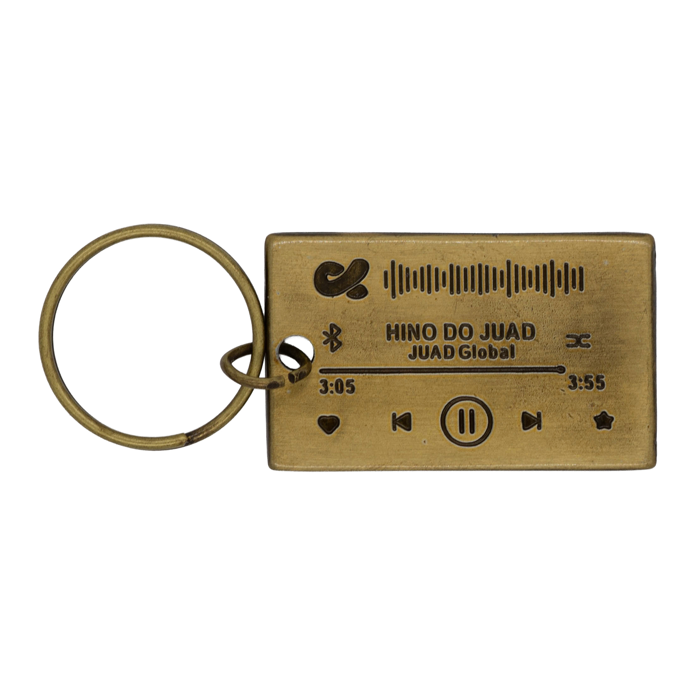 Chaveiro em metal na cor dourada com o logo do JUAD gravado diversas vezes em um lado e no outro em alusão ao Spotify o Hino do JUAD.