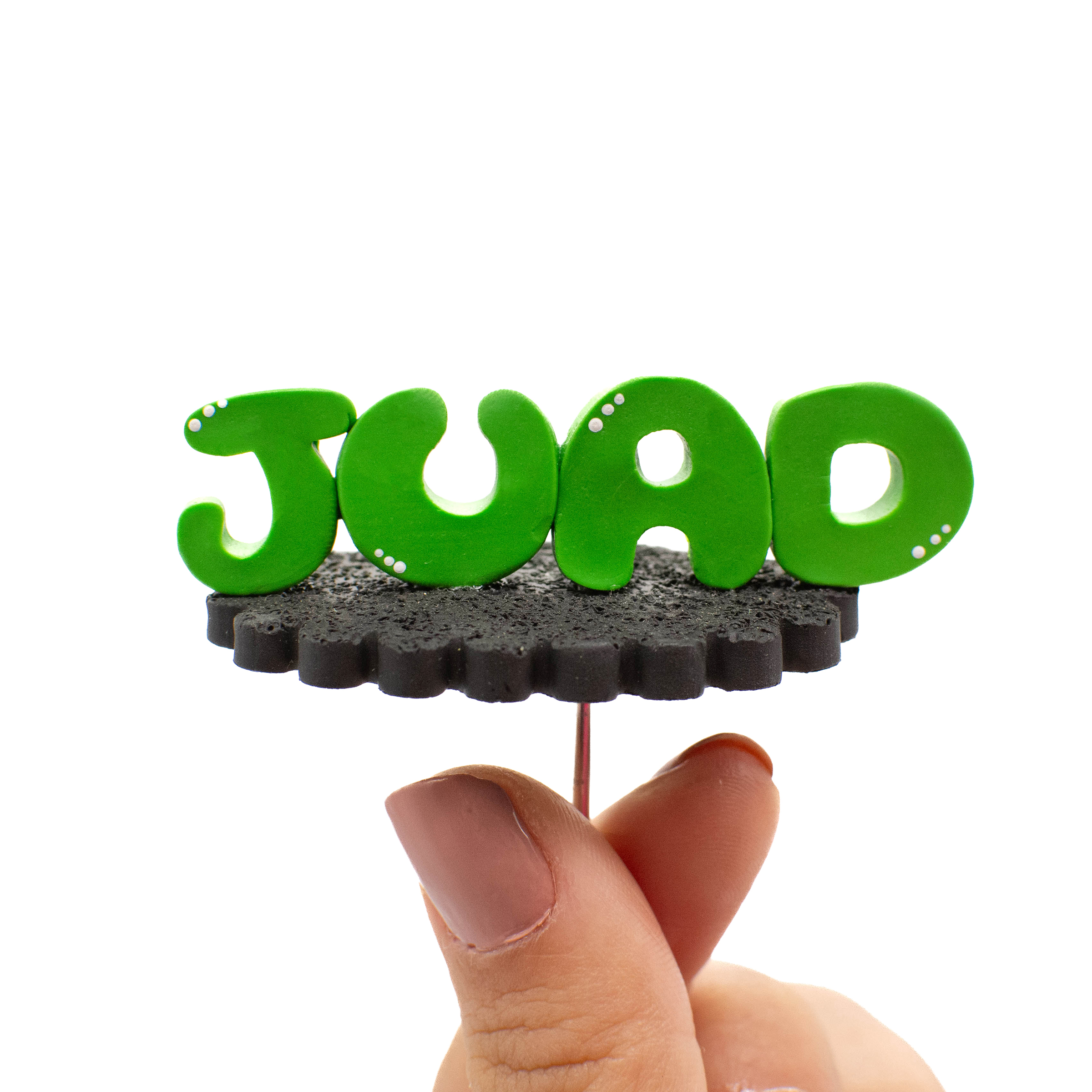 Enfeite de chimarrão em biscuit com o nome JUAD escrito na vertical nas cores do JUAD. Perfeito para deixar o seu mate com a cara do JUAD.