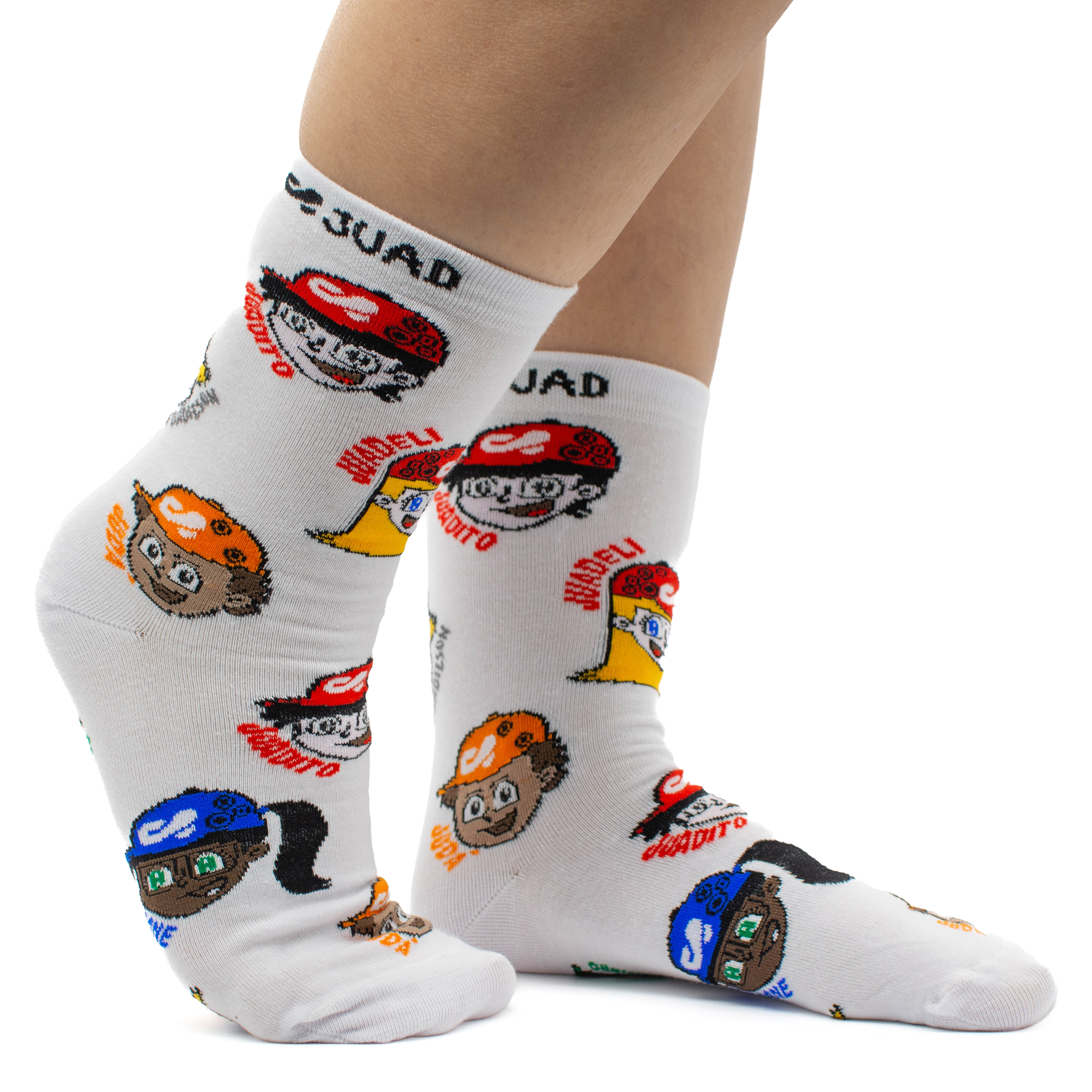 Meia na cor branca com estampa da Turma do JUAD. Meia em algodão, poliamida e elastano. Essa é a meia para você levar a Turma do JUAD para onde você for.