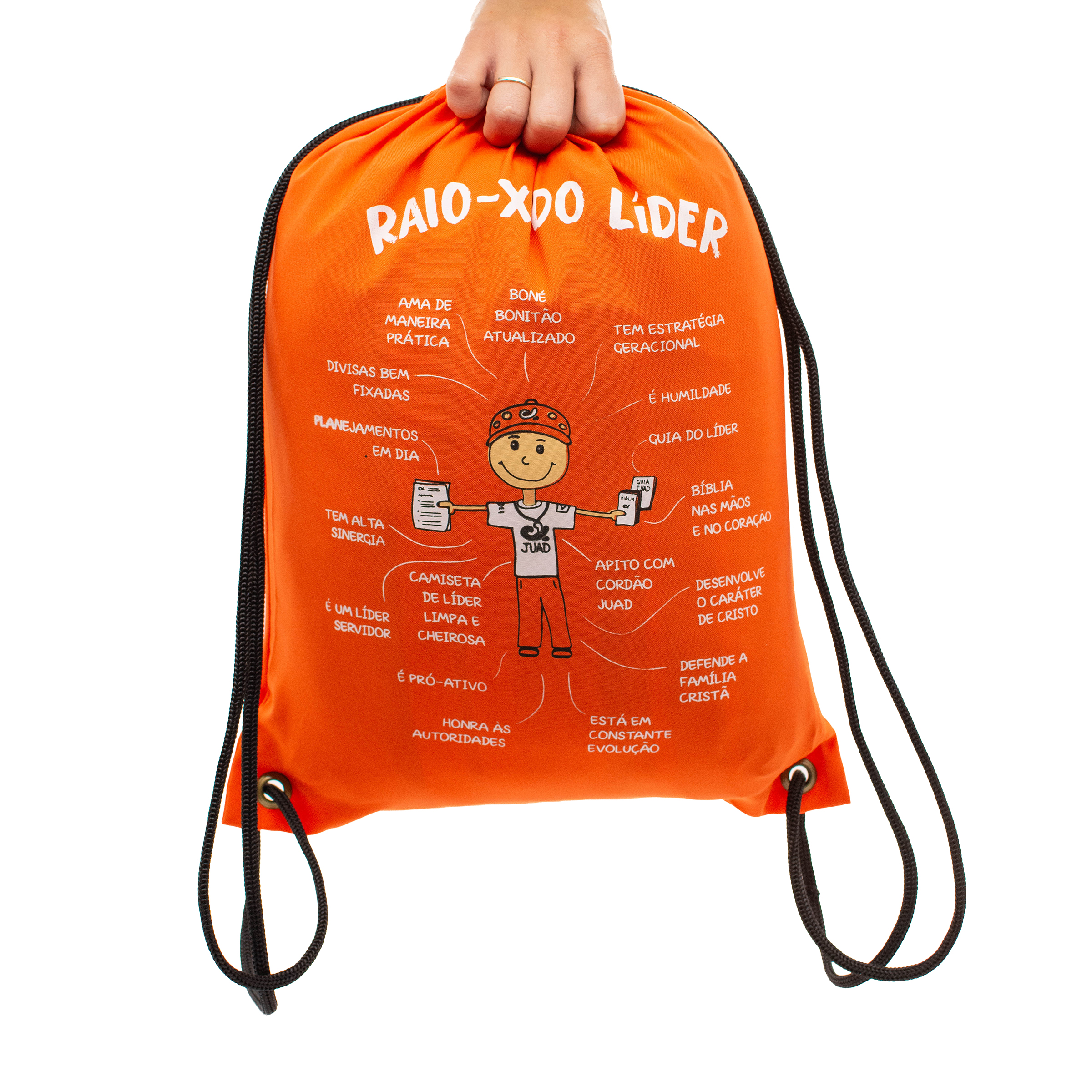 Bolsa modelo "saco de gato" nas cores do JUAD, em tecido tipo lona com estampa Raio-X do Líder JUAD. Ótimo utensílio para o dia-a-dia e os dias de atividades do JUAD.