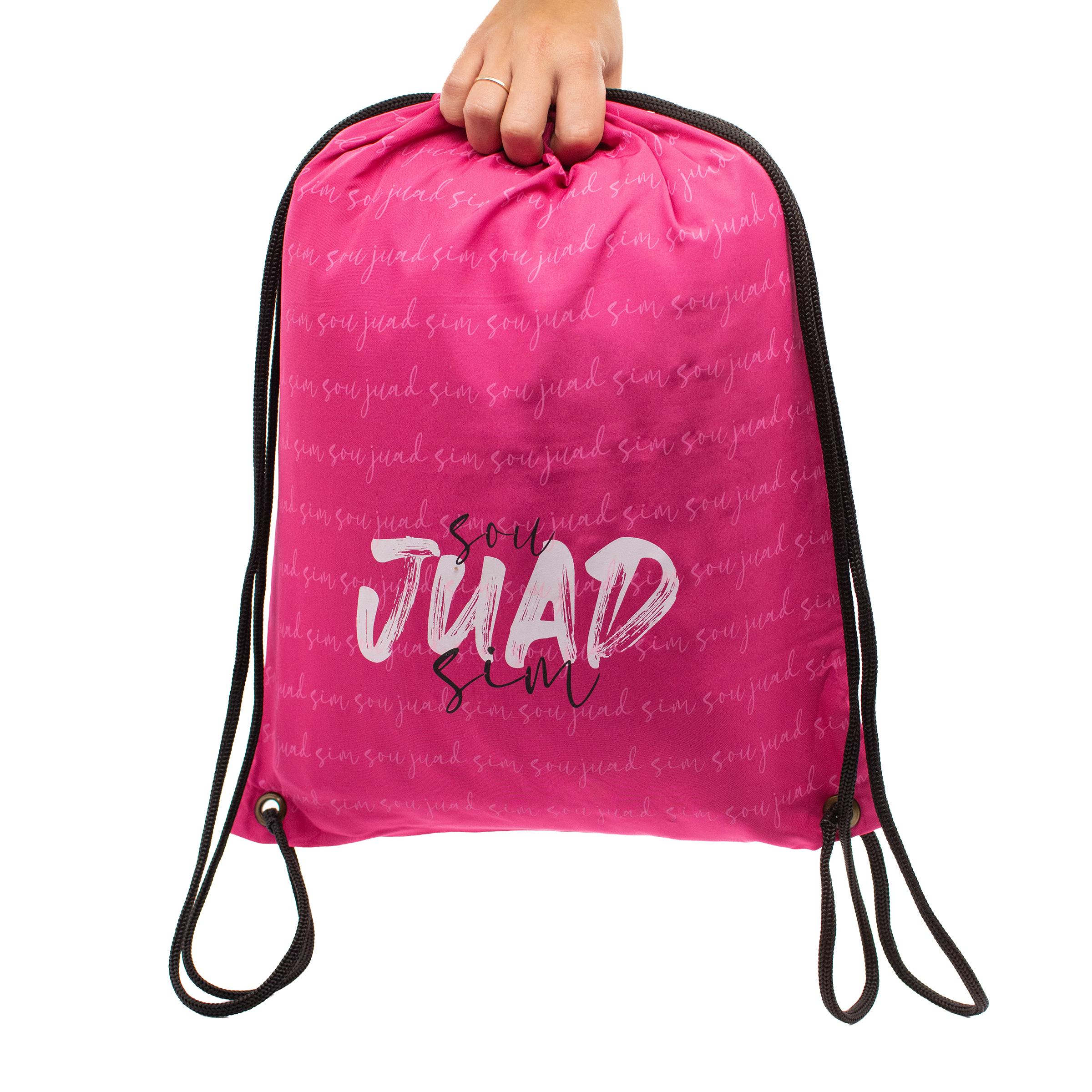 Bolsa modelo "saco de gato" na cor rosa, em tecido tipo lona com estampa do Sou JUAD Sim.Ótimo utensílio para o dia-a-dia e os dias de atividades do JUAD.